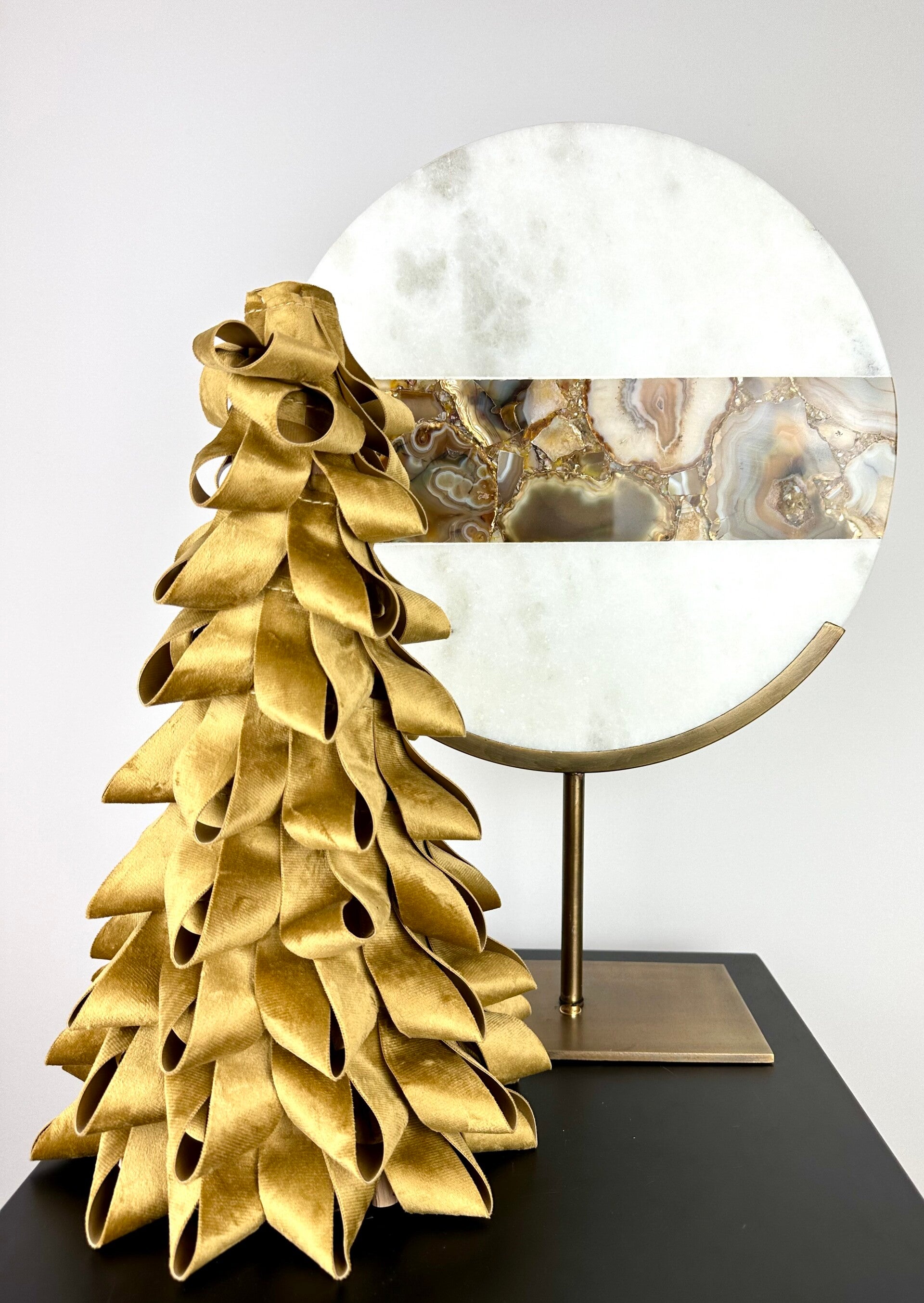 Voeg elegantie toe aan je kerstdecoraties met onze kerstboom in fluweel goud, verkrijgbaar in drie maten. Het luxe fluweel vangt het licht op een verfijnde manier, waardoor een warme en glamoureuze sfeer ontstaat. Combineer de boom met onze unieke edelstenen voor een extra magisch effect.